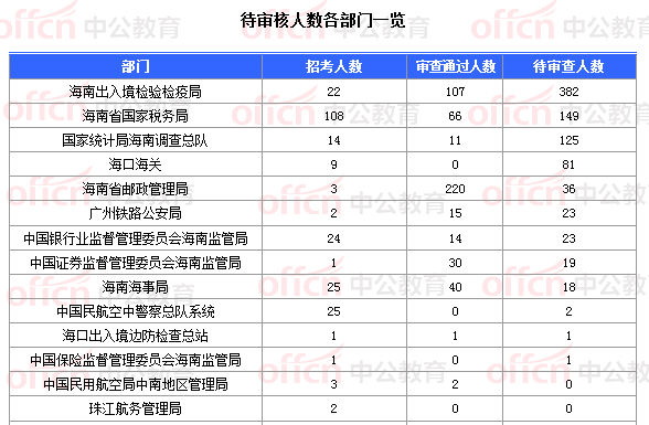 截止到31日18時,通過審核人數(shù)前三位的部門依次是:海南省郵政管理局、海南出入境檢驗檢疫局、海南省國家稅務(wù)局,三部門通過審核總?cè)藬?shù)達393人,占通過審核總?cè)藬?shù)的77.67%。