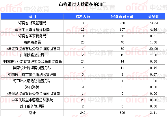 截至10月31日18時,據(jù)中公網(wǎng)校統(tǒng)計,國考職位中工作地點在海南的職位通過審核總?cè)藬?shù)為506人,共有100個職位無人通過審核,其中還有部分待審核的人數(shù)高達860人,平均競爭比例為2.11:1。