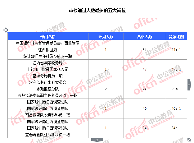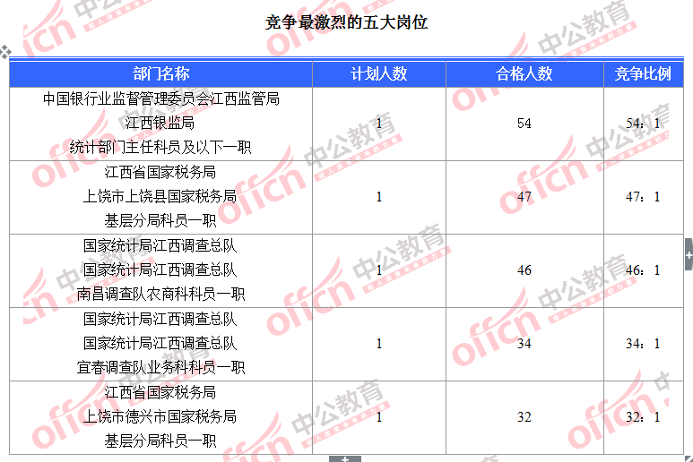 截至10月31日18時,據江西中公教育統(tǒng)計,國考職位中工作地點在江西的職位中共有2464人報名,其中1288人待審核,1176人已通過,競爭的崗位為江西銀監(jiān)局統(tǒng)計部門主任科員及以下一職(職位代碼400148101003),競爭比為54:1。
