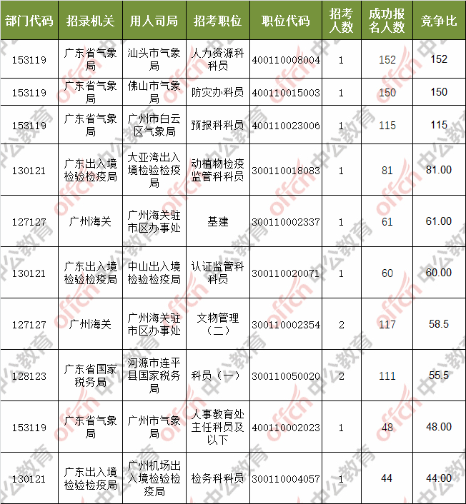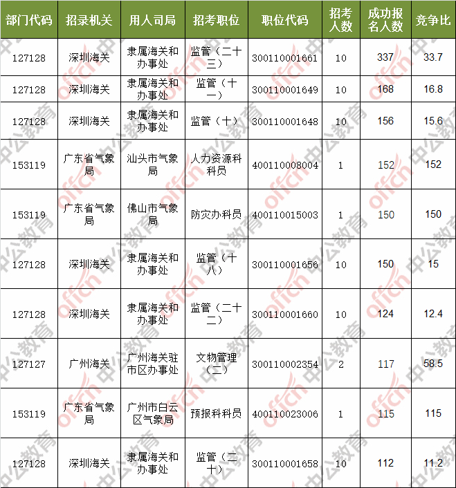 報(bào)名通過(guò)審核人數(shù)前十的職位主要集中在深圳海關(guān)、廣東省氣象局、廣州海關(guān),具體信息如下: