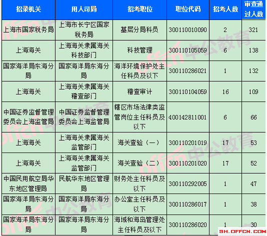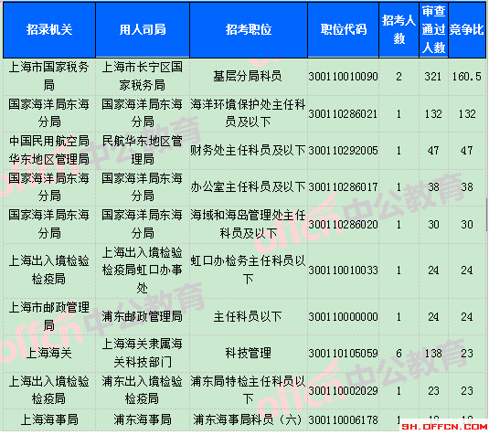 截止到31日18時,競爭比例的職位為上海市國家稅務(wù)局上海市長寧區(qū)國家稅務(wù)局基層分局科員一職,招錄2人,截止到31日18時通過人數(shù)為321人。報名通過審核人數(shù)前十的職位主要集中在上海市國家稅務(wù)局,上海海關(guān),國家海洋局東海分局等部門,具體信息如下: