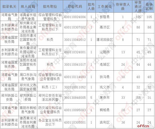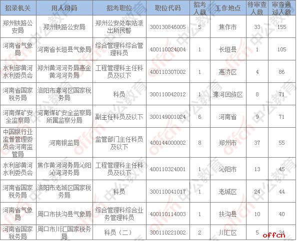 報(bào)名通過(guò)審核人數(shù)前十的職位主要集中在河南省國(guó)家稅務(wù)局、鄭州鐵路公安局、中國(guó)銀行業(yè)監(jiān)督管理委員會(huì)河南監(jiān)管局、水利部黃河水利委員會(huì)等部門(mén),具體信息如下: