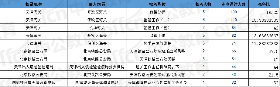 報名通過審核人數(shù)前十的職位主要集中在天津海關(guān)、北京鐵路公安局、天津出入境檢驗檢疫局等部門,具體信息如下: