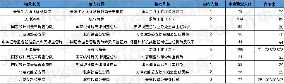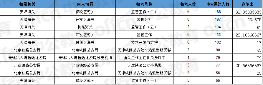 報名通過審核人數(shù)前十的職位主要集中在天津海關(guān)、北京鐵路公安局、天津出入境檢驗檢疫局等部門,具體信息如下: