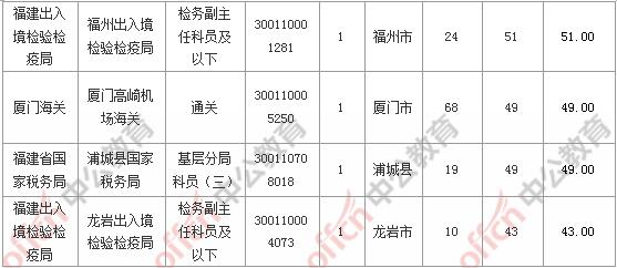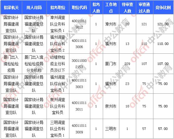 報(bào)名通過審核人數(shù)前十的職位主要集中在國家統(tǒng)計(jì)局福建調(diào)查總隊(duì)、廈門出入境檢驗(yàn)檢疫局、福建出入境檢驗(yàn)檢疫局等部門,具體信息如下: