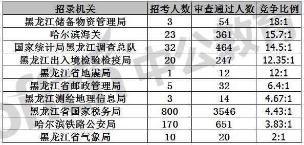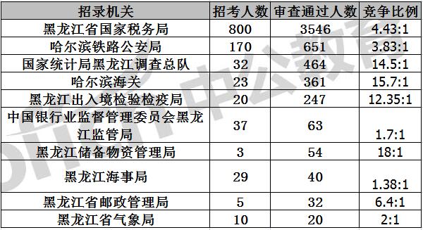 截止到11月1日16時,通過審核人數(shù)前三位的部門依次是:黑龍江省國家稅務局、哈爾濱鐵路公安局、國家統(tǒng)計局黑龍江調(diào)查總隊,三部門通過審核總?cè)藬?shù)達4661人,占通過審核總?cè)藬?shù)的84.3%。