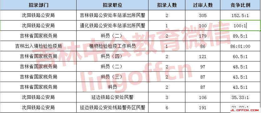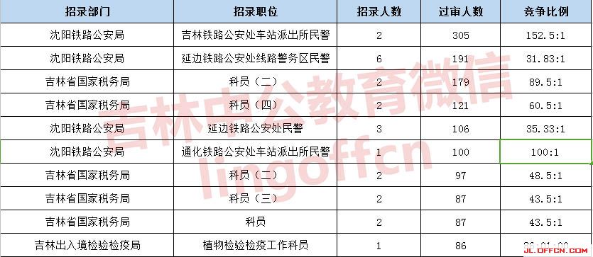 報名通過審核人數(shù)前十的職位主要集中在沈陽鐵路公安局、吉林國家稅務(wù)局、吉林出入境檢疫檢驗(yàn)局等部門,具體信息如下:
