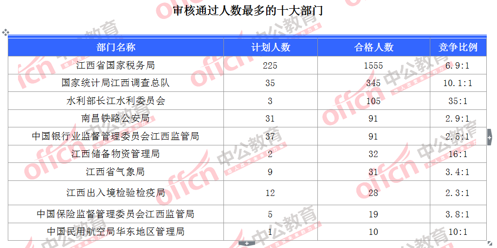截止到1日17時,通過審核人數(shù)前三位的部門依次是:江西省國家稅務(wù)局、國家統(tǒng)計局江西調(diào)查總隊、水利部長江水利委員會,三部門通過審核總?cè)藬?shù)達(dá)2005人,占通過審核總?cè)藬?shù)的86.3%。