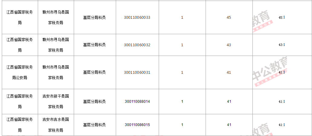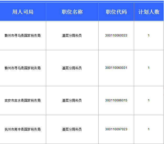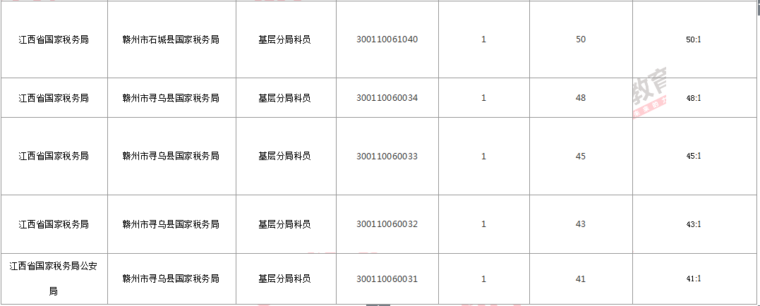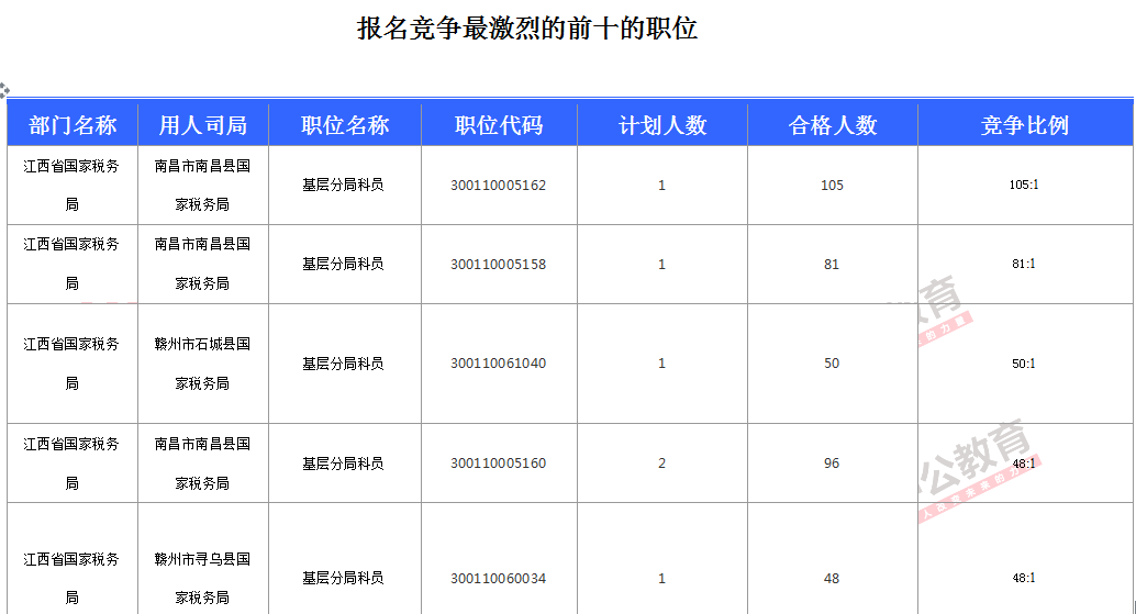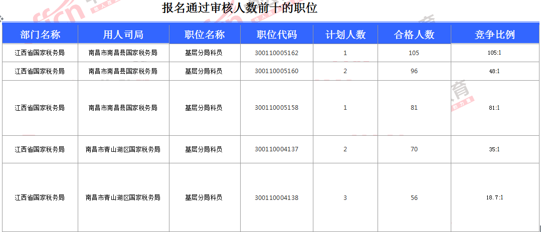 報名通過審核人數(shù)前十的職位主要集中在江西省國家稅務(wù)局這個部門,具體信息如下: