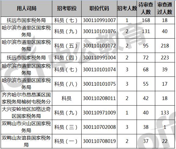 截止1日16時黑龍江省國家稅務局有2018人待審,占所有目前待審人數(shù)的55.32%,當前待審人數(shù)最多的是撫遠市國家稅務局,職位代碼300110991007一職,招1人,168人報名待審,18人報名審核通過。