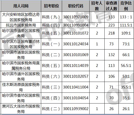由于黑龍江省國家稅務局整體招錄人數(shù)比較多,所以部門整體競爭比例比較小,但從招錄人數(shù)最多的和競爭比例的職位來看,前三名都集中在該部門。當前是大興安嶺地區(qū)加格達奇區(qū)國家稅務局職位代碼300110971009的崗位競爭比例,達133:1。