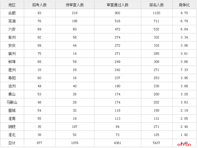 截止到1日18時(shí),安徽地區(qū)16個(gè)地市通過審核的人數(shù)如下,其中合肥市通過審核人數(shù)最多;為902人,淮北市通過審核人數(shù)最少,為73人。合肥市的競爭最激烈,為9.70:1。