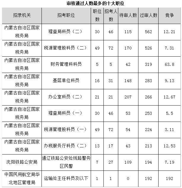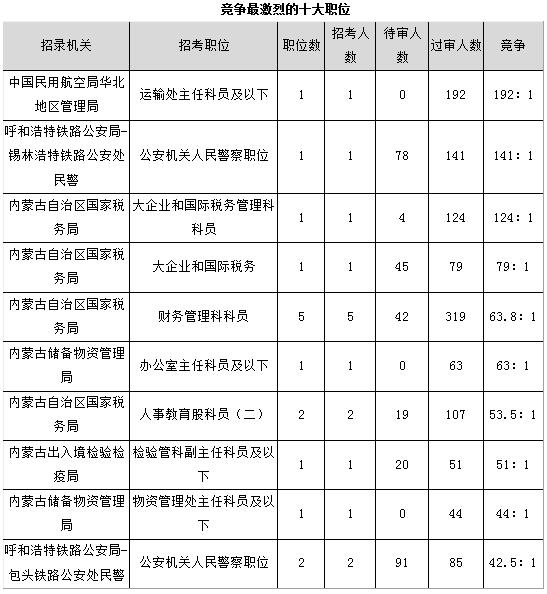 截止到11月1日日16時(shí),競(jìng)爭(zhēng)比例的部門為中國(guó)民用航空局華北地區(qū)管理局,招錄1人,截止到1日日16時(shí)待審人數(shù)0人,過(guò)審人數(shù)為192人,總計(jì)報(bào)名人數(shù)為192人,競(jìng)爭(zhēng)比例為192:1,是報(bào)名第三天內(nèi)蒙古職位競(jìng)爭(zhēng)力的職位。