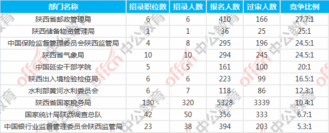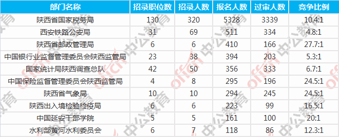 截至到2日9時(shí),通過審核人數(shù)前三位的部門依次是:陜西省國家稅務(wù)局、西安鐵路公安局、國家統(tǒng)計(jì)局陜西調(diào)查總隊(duì),三部門通過審核總?cè)藬?shù)達(dá)4006人,占通過審核總?cè)藬?shù)的76.6%。 一、各部門報(bào)名人數(shù)分析