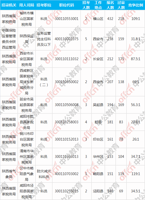 報(bào)名人數(shù)前十的職位主要集中在陜西省國(guó)家稅務(wù)局、中國(guó)保險(xiǎn)監(jiān)督管理委員會(huì)陜西監(jiān)管局、陜西省氣象局等部門(mén),具體信息如下: