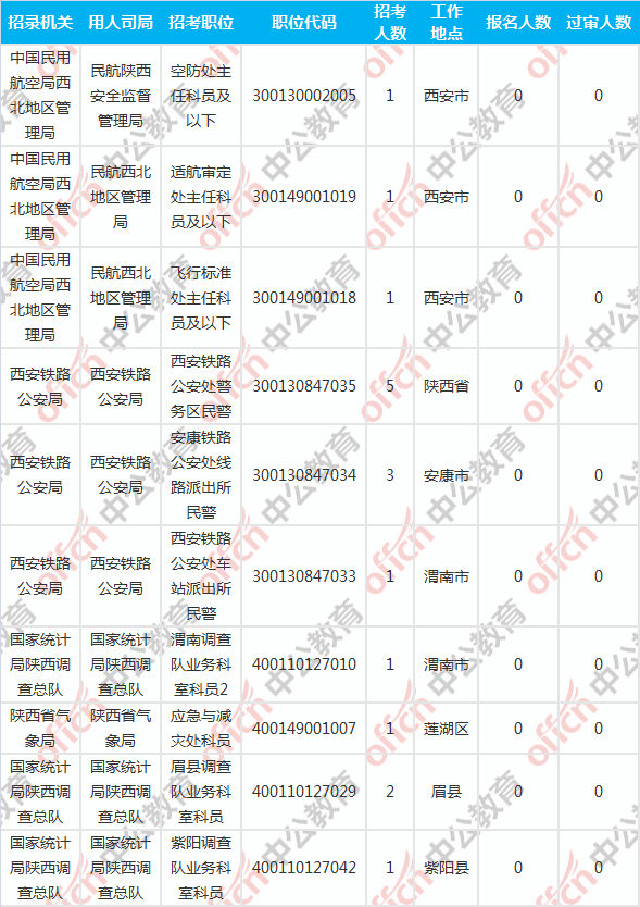 截至到2日9時,工作地點在陜西的職位共有10個無人報考,占全部職位的3.48%。下面是無人報考職位一覽表,中公網(wǎng)校專家建議廣大考生多關(guān)注一些較冷職位,避免激烈競爭,結(jié)合自身條件,找到屬于自己的職位。
