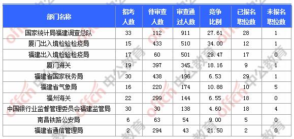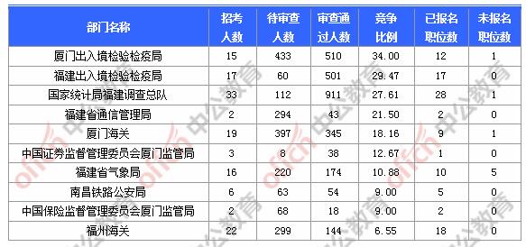 截止到2日9時,通過審核人數(shù)前三位的部門依次是:國家統(tǒng)計局福建調(diào)查總隊、門出入境檢驗檢疫局、福建出入境檢驗檢疫局,三部門通過審核總?cè)藬?shù)達1922人,占通過審核總?cè)藬?shù)的61.03%。