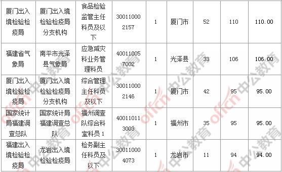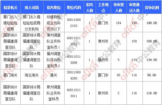 報名通過審核人數(shù)前十的職位主要集中在廈門出入境檢驗(yàn)檢疫局、國家統(tǒng)計局福建調(diào)查總隊、廈門海關(guān),具體信息如下: