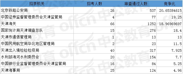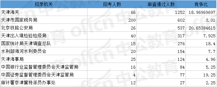 為幫助廣大考生更清晰的了解今日報名情況,中公網(wǎng)校整理了審核通過人數(shù)前十位的部門以及競爭比例最激烈的十大部門,供廣大考生參考: