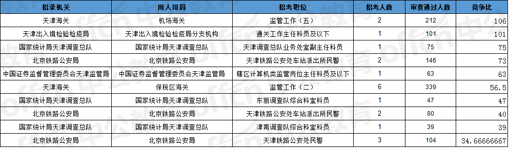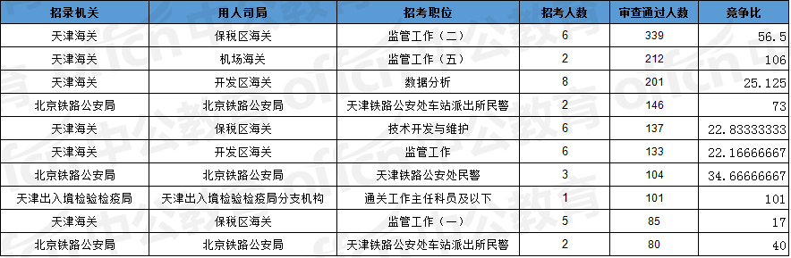 報(bào)名通過(guò)審核人數(shù)前十的職位主要集中在天津海關(guān)、北京鐵路公安局、天津出入境檢驗(yàn)檢疫局等部門,具體信息如下: