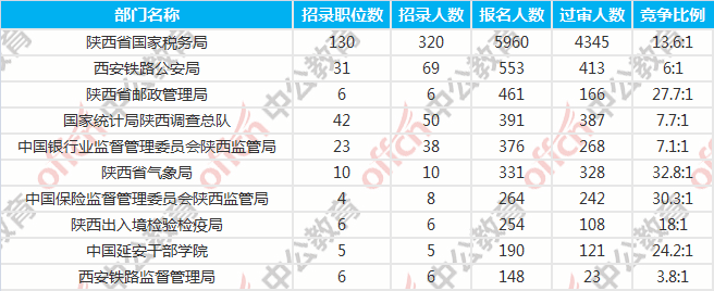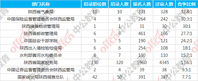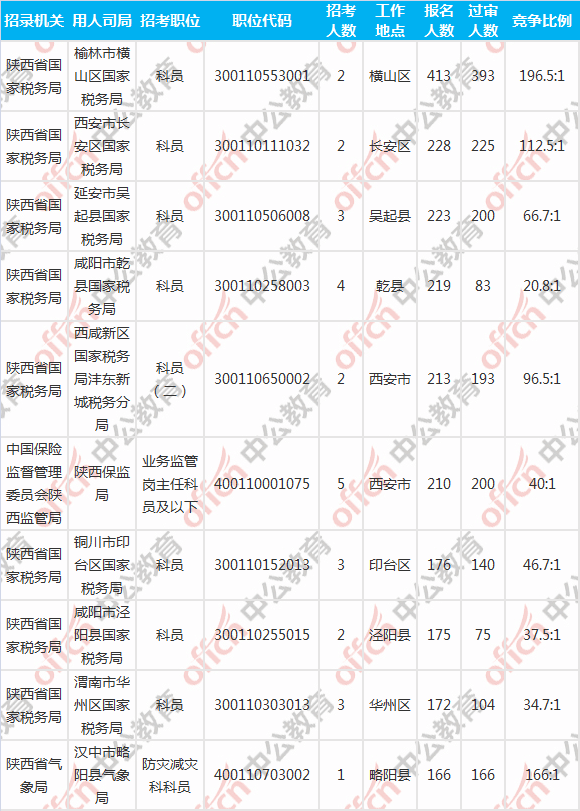 報(bào)名人數(shù)前十的職位主要集中在陜西省國家稅務(wù)局、中國保險(xiǎn)監(jiān)督管理委員會陜西監(jiān)管局、陜西省氣象局等部門,具體信息如下: