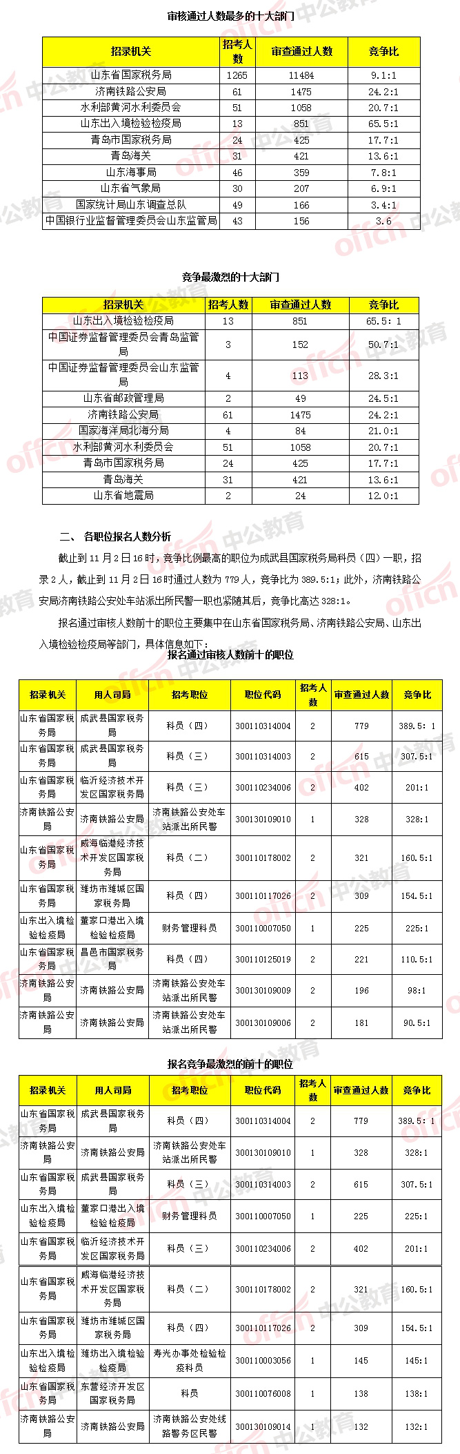截止到11月2日16時(shí),通過審核人數(shù)前三位的部門依次是:山東省國家稅務(wù)局、濟(jì)南鐵路公安局、水利部黃河水利委員會(huì),三部門通過審核總?cè)藬?shù)達(dá)14017人,占通過審核總?cè)藬?shù)的81.2%。