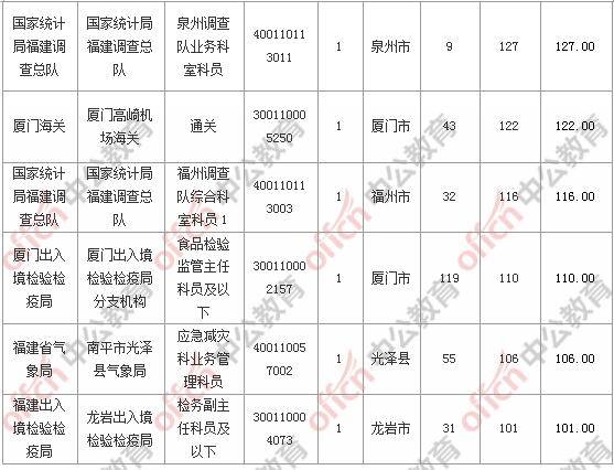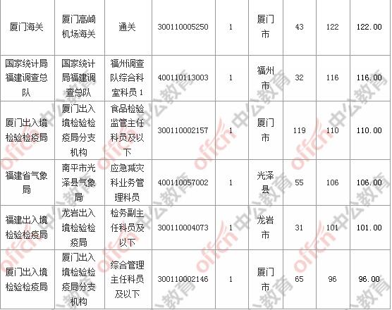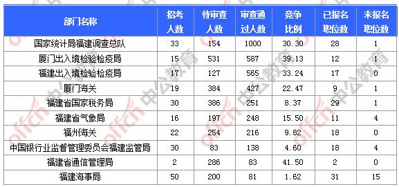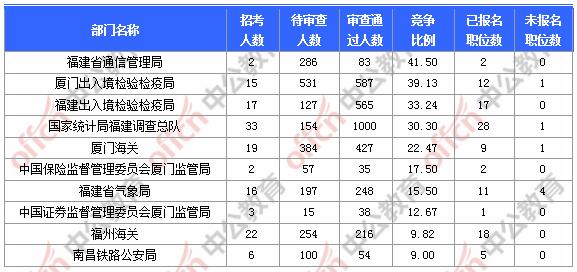 報(bào)名通過審核人數(shù)前十的職位主要集中在廈門出入境檢驗(yàn)檢疫局、國(guó)家統(tǒng)計(jì)局福建調(diào)查總隊(duì)、廈門海關(guān)等部門,具體信息如下: