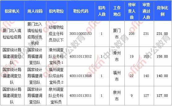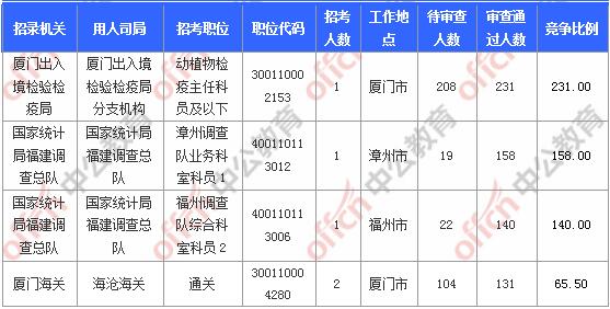 截止到2日16時(shí),競(jìng)爭(zhēng)比例的職位為廈門出入境檢驗(yàn)檢疫局廈門出入境檢驗(yàn)檢疫局分支機(jī)構(gòu)動(dòng)植物檢疫主任科員及以下300110002153一職,招錄1人,截止到2日16時(shí)通過人數(shù)為231人,競(jìng)爭(zhēng)比例231:1!