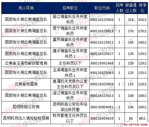 截止11月2日16時(shí),國(guó)考報(bào)名第三天,國(guó)家統(tǒng)計(jì)局云南調(diào)查總隊(duì),麗江調(diào)查隊(duì)業(yè)務(wù)科室科員,職位代碼:400110125006,招錄1人,審查通過(guò)人數(shù)為316人,具體信息如下: