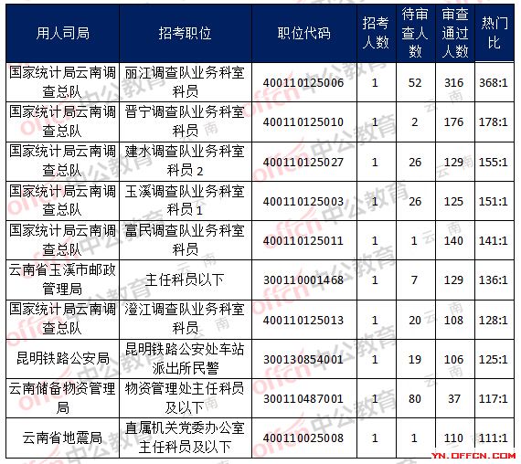當(dāng)前最受歡迎的崗位是國(guó)家統(tǒng)計(jì)局云南調(diào)查總隊(duì),麗江調(diào)查隊(duì)業(yè)務(wù)科室科員,職位代碼:400110125006