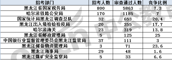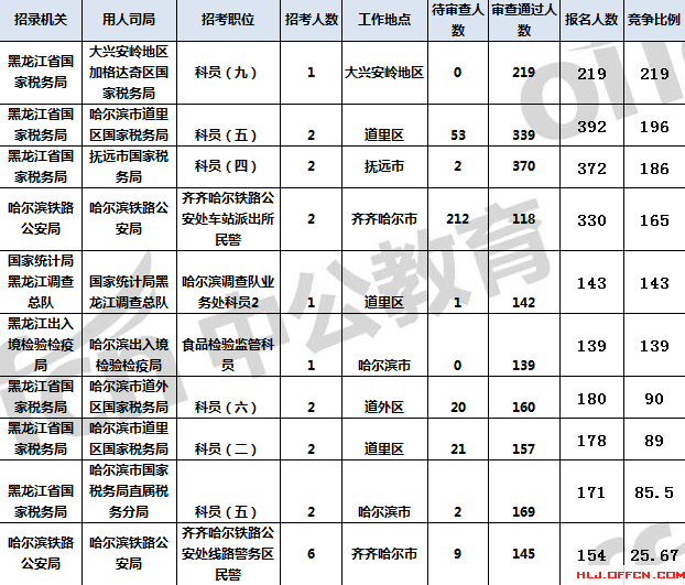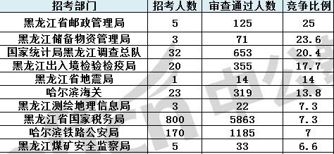 報(bào)名通過(guò)審核人數(shù)前十的職位主要集中在黑龍江省國(guó)家稅務(wù)局、國(guó)家統(tǒng)計(jì)局黑龍江調(diào)查總隊(duì)、黑龍江出入境檢驗(yàn)檢疫局等部門,具體信息如下: