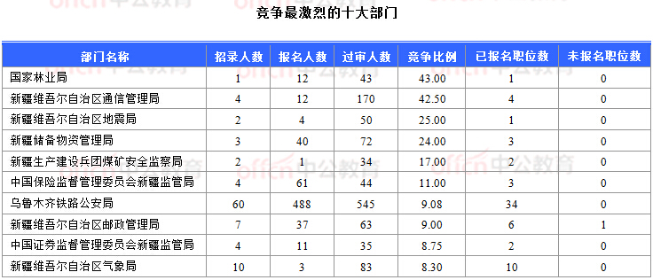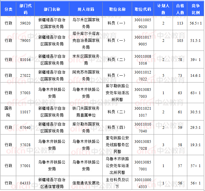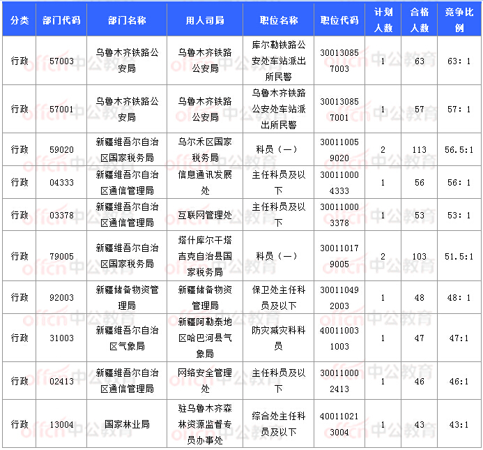 報名通過審核人數(shù)前十的職位主要集中在烏魯木齊鐵路公安局、新疆維吾爾自治區(qū)國家稅務局、新疆維吾爾自治區(qū)通信管理局、新疆維吾爾自治區(qū)郵政管理局,具體信息如下:
