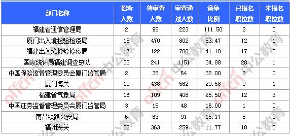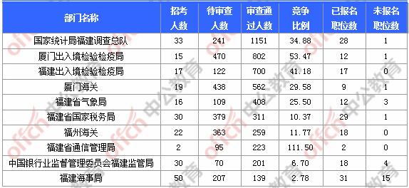 截止到3日9時(shí),通過(guò)審核人數(shù)前三位的部門(mén)依次是:國(guó)家統(tǒng)計(jì)局福建調(diào)查總隊(duì)、廈門(mén)出入境檢驗(yàn)檢疫局、福建出入境檢驗(yàn)檢疫局,三部門(mén)通過(guò)審核總?cè)藬?shù)達(dá)2653人,占通過(guò)審核總?cè)藬?shù)的52.79%。