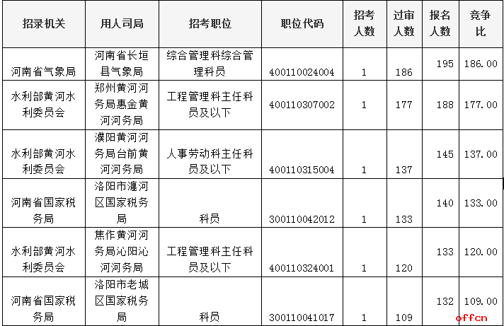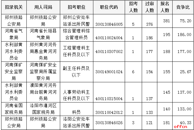 報(bào)名通過(guò)審核人數(shù)前十的職位主要集中在鄭州鐵路公安局、河南省氣象局、水利部黃河水利委員會(huì)等部門(mén),具體信息如下: