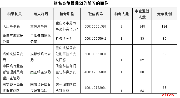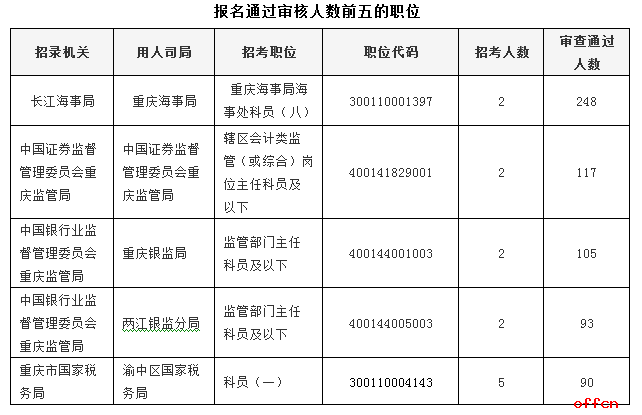 報(bào)名通過審核人數(shù)前五的職位主要集中在中國銀行業(yè)監(jiān)督管理委員會(huì)重慶監(jiān)管局、長江海事局、重慶市國家稅務(wù)局等部門,具體信息如下: