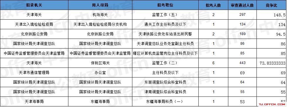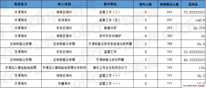 報(bào)名通過(guò)審核人數(shù)前十的職位主要集中在天津海關(guān)、北京鐵路公安局、天津出入境檢驗(yàn)檢疫局等部門(mén),具體信息如下: