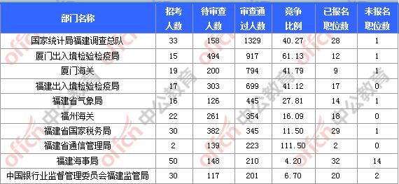 截至11月3日16時(shí),據(jù)中公網(wǎng)校統(tǒng)計(jì),國(guó)考職位中工作地點(diǎn)在福建的職位2527人待審,5824人通過(guò)審核,共報(bào)名6607人,其中有21個(gè)職位無(wú)人報(bào)名,平均競(jìng)爭(zhēng)比例為22.31:1。