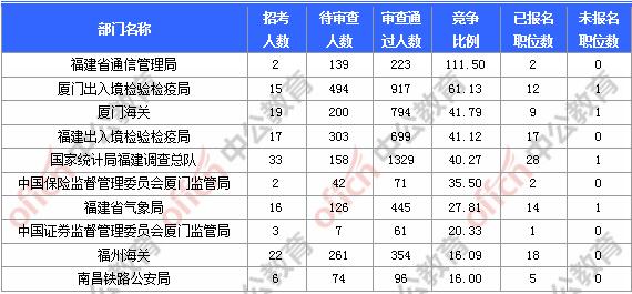 截止到3日16時(shí),通過(guò)審核人數(shù)前三位的部門(mén)依次是:國(guó)家統(tǒng)計(jì)局福建調(diào)查總隊(duì)、廈門(mén)出入境檢驗(yàn)檢疫局、廈門(mén)海關(guān),三部門(mén)通過(guò)審核總?cè)藬?shù)達(dá)3040人,占通過(guò)審核總?cè)藬?shù)的52.19%。