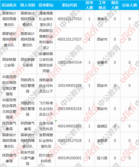 截至到3日16時(shí),工作地點(diǎn)在陜西的職位共有8個(gè)無(wú)人報(bào)考,占全部職位的2.79%。下面是無(wú)人報(bào)考職位一覽表,中公網(wǎng)校建議廣大考生多關(guān)注一些較冷職位,避免激烈競(jìng)爭(zhēng),結(jié)合自身?xiàng)l件,找到屬于自己的職位。