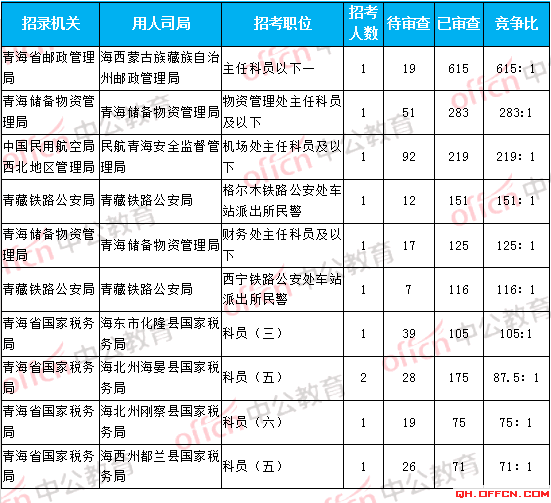 以下是3日16時(shí)各部門報(bào)名人數(shù)統(tǒng)計(jì)分析,其中中國(guó)民航青海安全監(jiān)督管理局、青海省物資儲(chǔ)備管理局、青海省郵政管理局等三個(gè)部門競(jìng)爭(zhēng)最激烈,競(jìng)爭(zhēng)比均超過(guò)116:1。