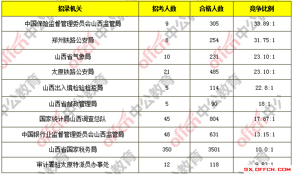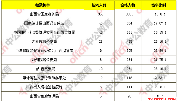 為幫助廣大考生更清晰的了解今日?qǐng)?bào)名情況,山西中公網(wǎng)校整理了審核通過人數(shù)前十位的部門以及競(jìng)爭(zhēng)比例最激烈的十大部門,供廣大考生參考: