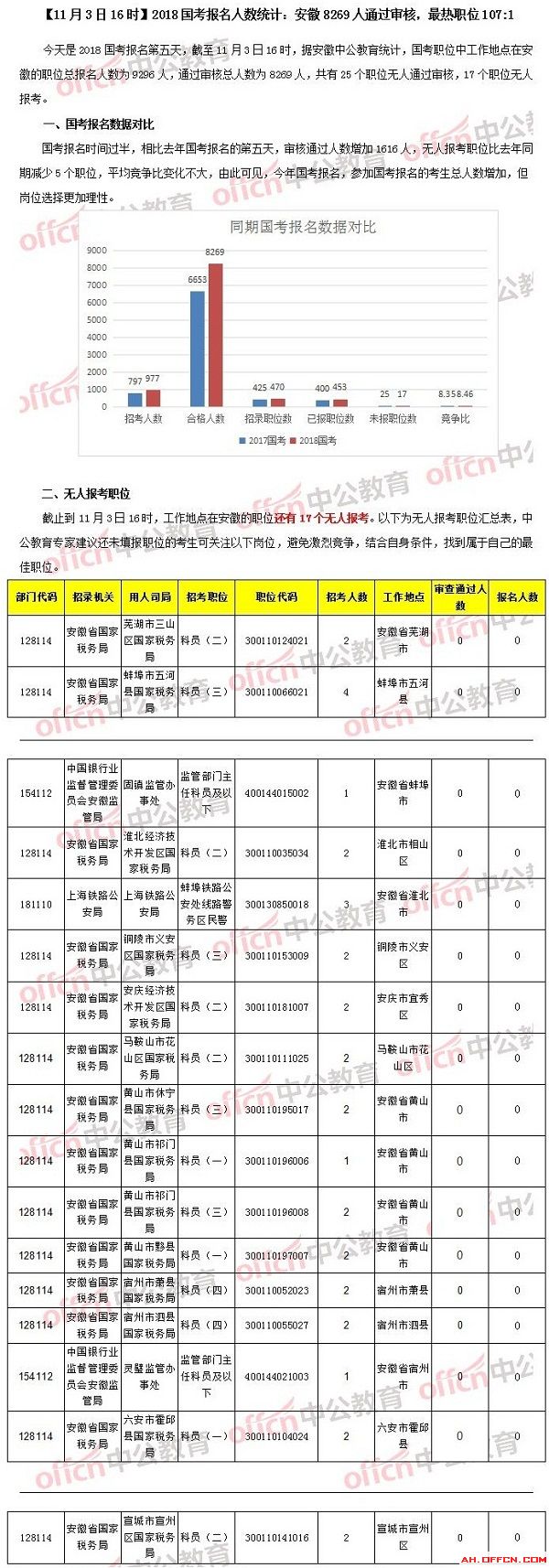 【11月3日16時】2018國考報名人數(shù)統(tǒng)計:安徽8269人通過審核,最熱職位107:1