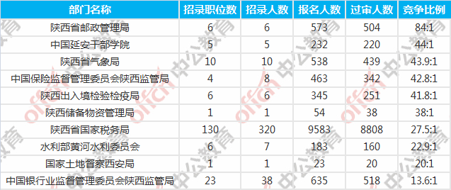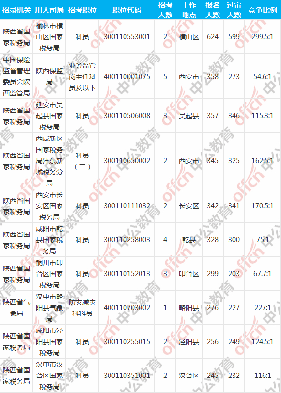 報名人數(shù)前十的職位主要集中在陜西省國家稅務(wù)局、中國保險監(jiān)督管理委員會陜西監(jiān)管局、陜西省氣象局等部門,具體信息如下: