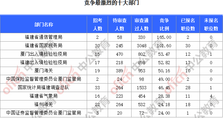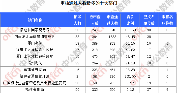 為幫助廣大考生更清晰的了解今日報名情況,福建中公教育專家整理了審核通過人數前十位的部門以及競爭比例最激烈的十大部門,供廣大考生參考: