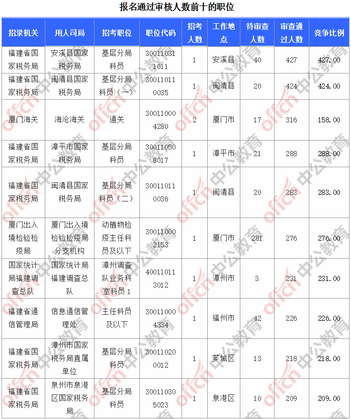 報名通過審核人數前十的職位主要集中在福建省國家稅務局、廈門海關、廈門出入境檢驗檢疫局等部門,具體信息如下: