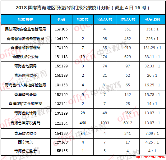以下是4日16時各部門報名人數(shù)統(tǒng)計分析,其中中國民航青海安全監(jiān)督管理局、青海省物資儲備管理局、青海省郵政管理局等三個部門競爭最激烈,競爭比均已超過131:1。