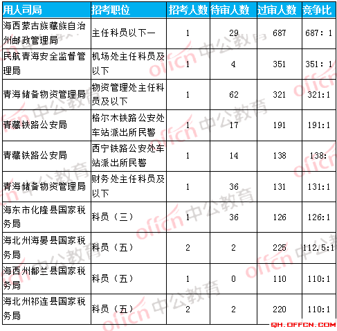 截至到4日16時,競爭比例的職位為海西蒙古族藏族自治州郵政管理局主任科員以下一職,招錄1人,截至到4日16時審核通過人數(shù)為687人,是此次國考青海地區(qū)競爭比例的一個職位!