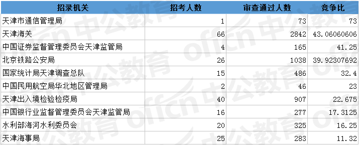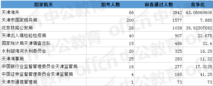 為幫助廣大考生更清晰的了解今日?qǐng)?bào)名情況,中公網(wǎng)校整理了審核通過(guò)人數(shù)前十位的部門以及競(jìng)爭(zhēng)比例最激烈的十大部門,供廣大考生參考: