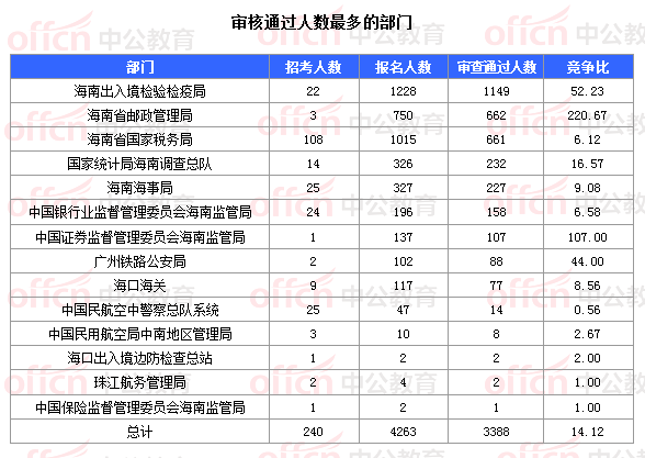 截止到5日16時(shí),通過(guò)審核人數(shù)前三位的部門(mén)依次是:海南出入境檢驗(yàn)檢疫局、海南省郵政管理局、海南省國(guó)家稅務(wù)局,三部門(mén)通過(guò)審核總?cè)藬?shù)達(dá)2472人,占通過(guò)審核總?cè)藬?shù)的72.96%。