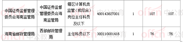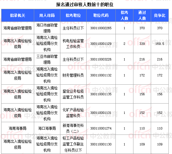 報(bào)名通過(guò)審核人數(shù)前十的職位主要集中在海南省郵政管理局、海南出入境檢驗(yàn)檢疫局、海南海事局等部門,具體信息如下: